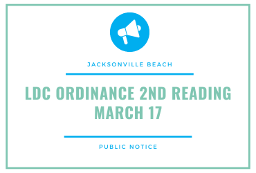 AN ORDINANCE OF THE CITY OF JACKSONVILLE BEACH, FLORIDA, REPEALING AND REPLACING CHAPTER 34 – LAND DEVELOPMENT CODE OF THE CITY’S CODE OF ORDINANCES IN ITS ENTIRETY; PROVIDING FOR LEGISLATIVE FINDINGS, REPEAL OF CONFLICTING ORDINANCES, SEVERABILITY, SCRIVENER’S ERRORS, CODIFICATION, AND AN EFFECTIVE DATE.